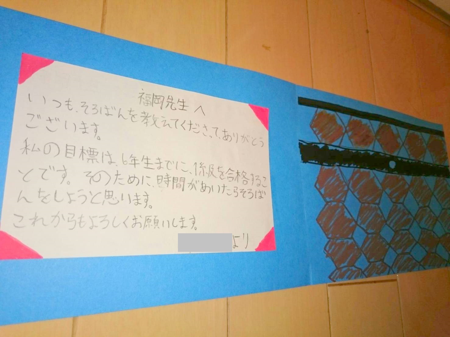 先日、ある生徒から画用紙でお手紙とそろばんの絵が描かれた