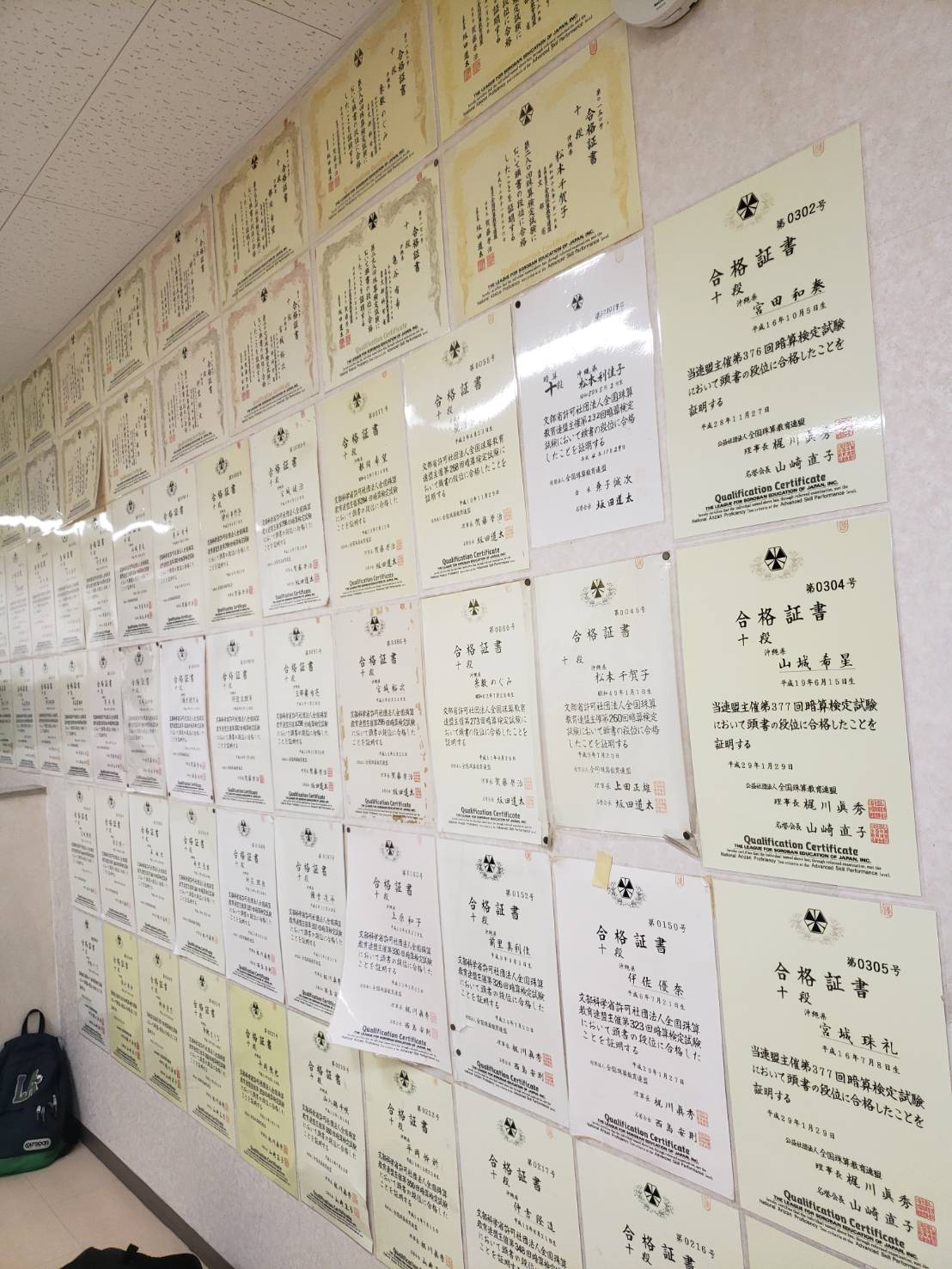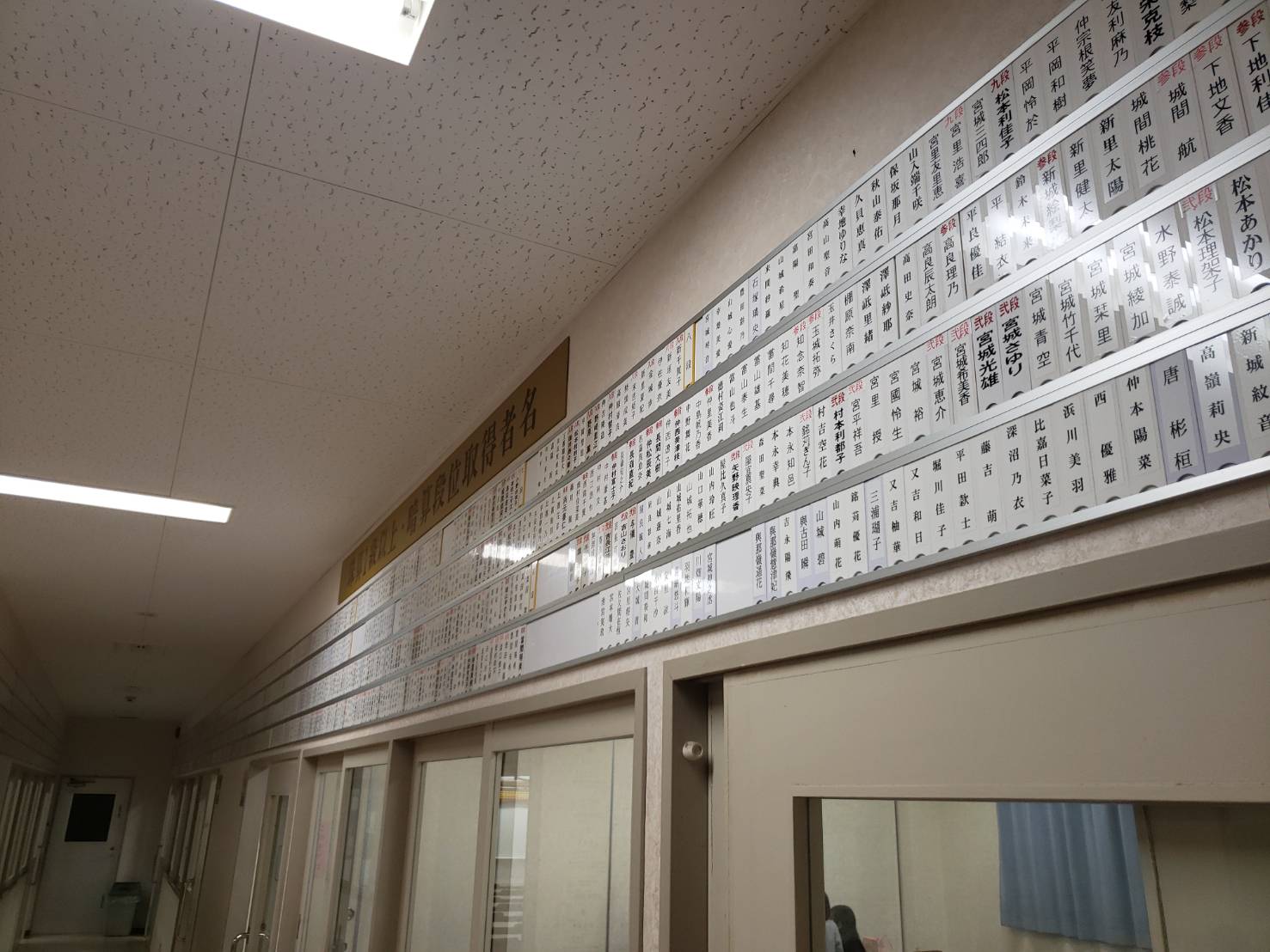 宮城珠算学校内二階廊下壁に貼りきれないほどたくさんの10段合格者、