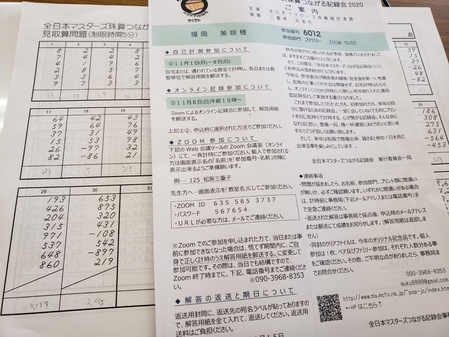 先週末は、オンラインで「全日本マスターズ珠算つながる記録会2020」に