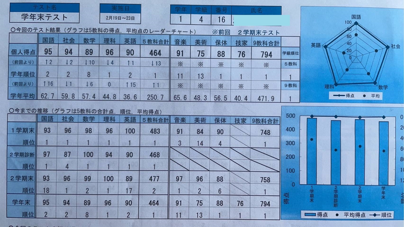 今回、先生のお母さまから中学1年生の時の成績を見せていただきました。