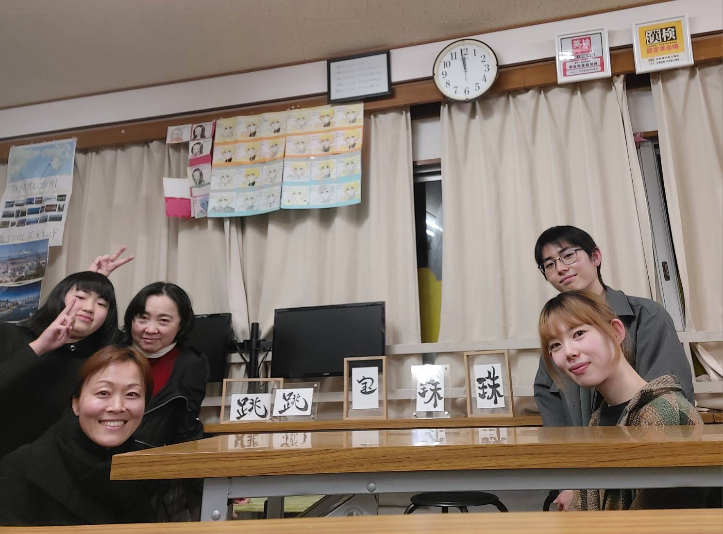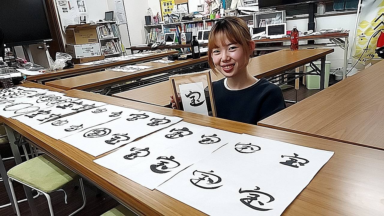 書道の練習、この春卒業するみなみ先生、バイトリーダーのそうま先生、娘も参加して、